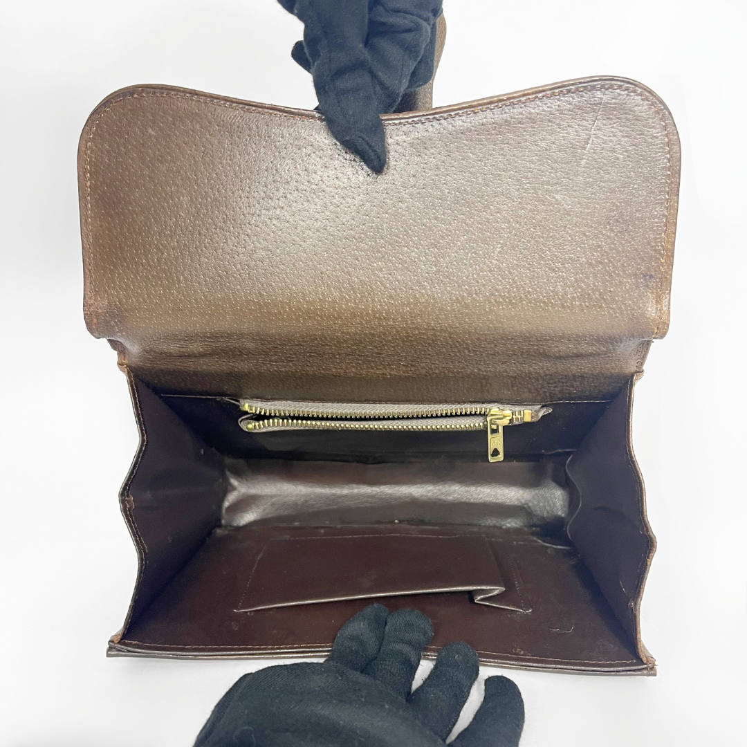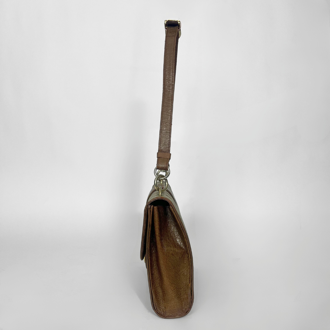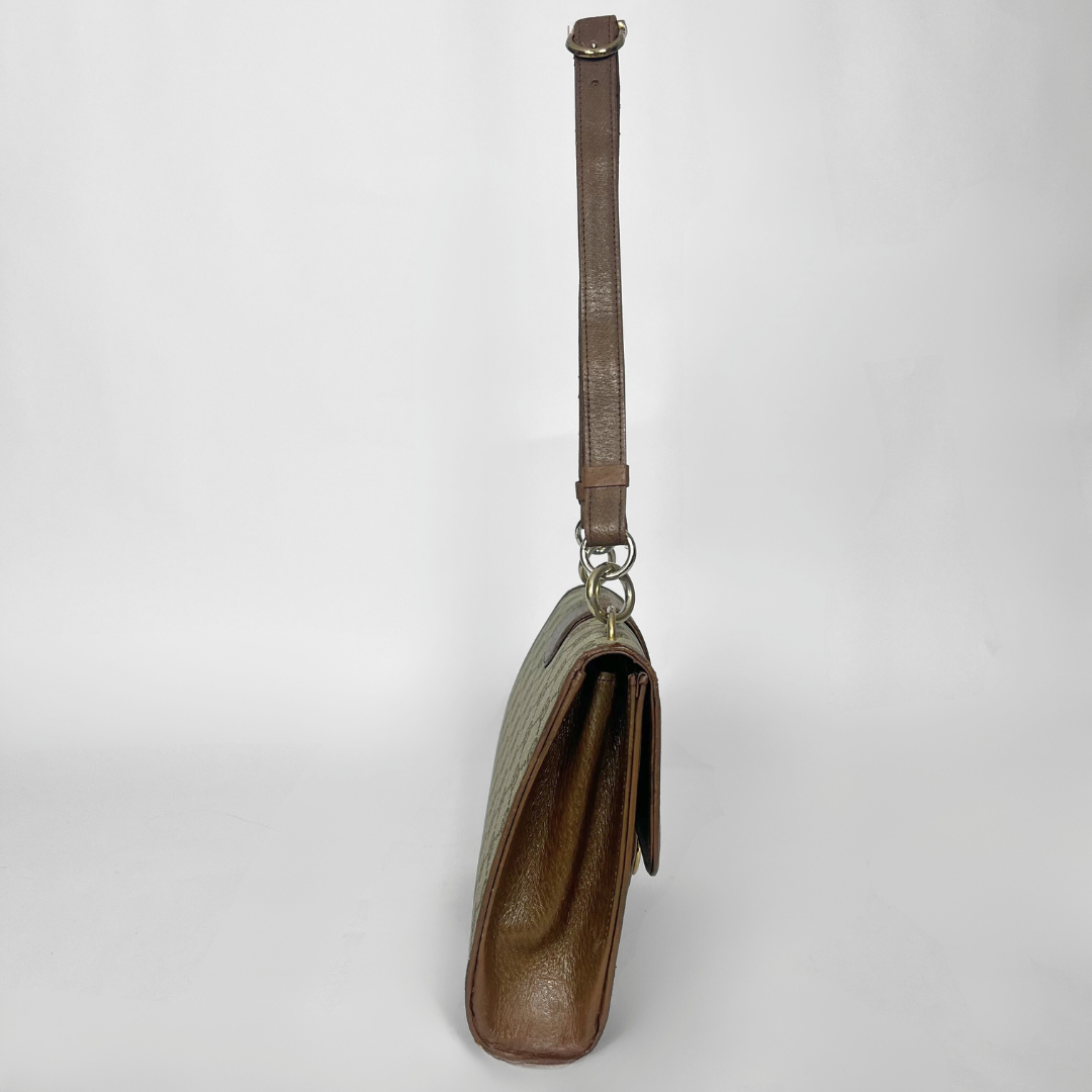 Gucci Vintage Bag in beige Canvas. The bag has silver-colored hardware and leather trims. The bag opens with a belt buckle and features one main compartment. The inside of the bag is made of brown leather and features only one zipper pocket and a slide in pocket. The bag can be worn on the shoulder.