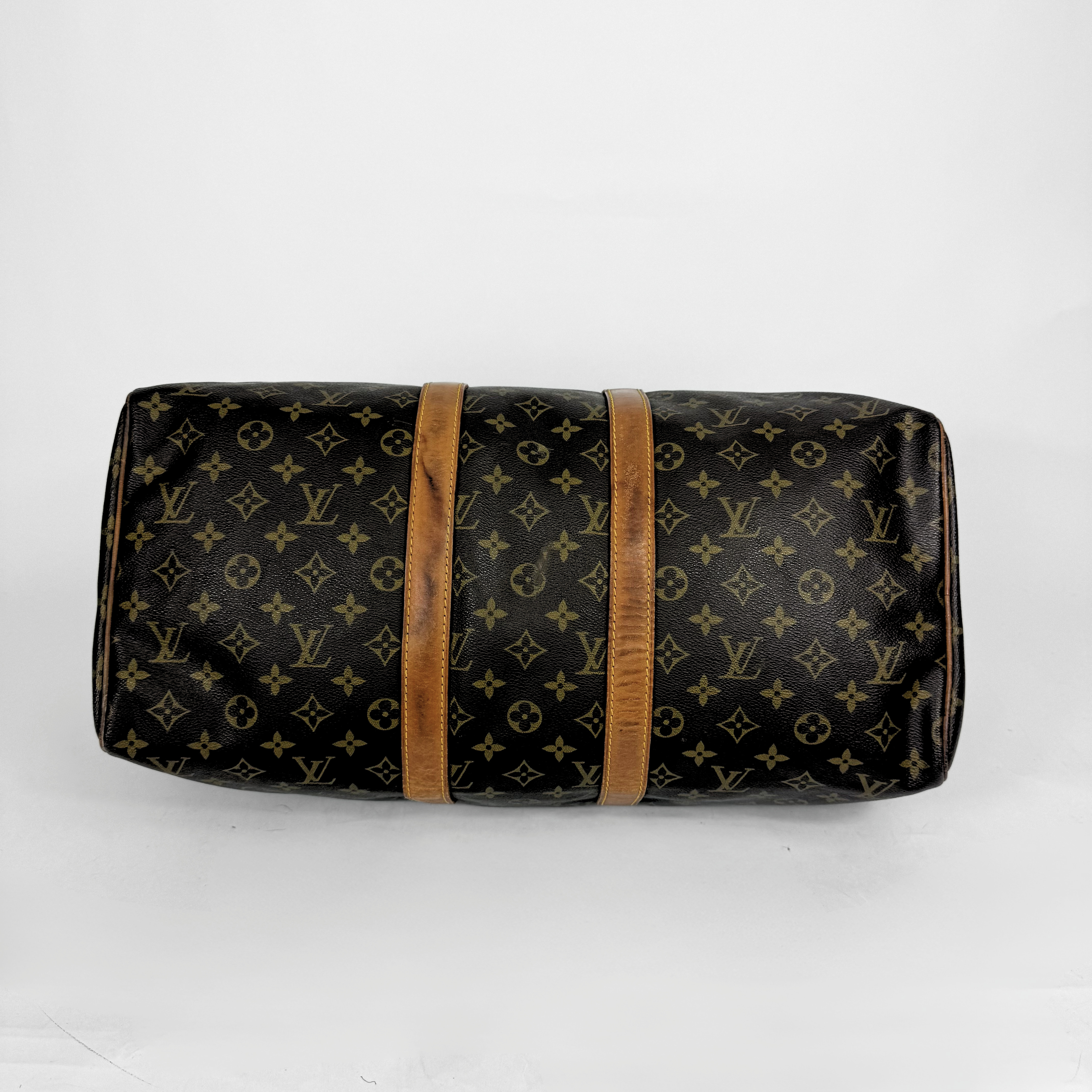 Louis Vuitton Keepall 45 in Monogram Canvas with gold-plated hardware and Vachetta leather details. The travel bag is covered in an iconic monogram created in 1896 thanks to Louis Vuitton’s son who wanted to celebrate his father’s legacy, who passed away four years before. The motif was composed of stylized flowers and letters geometrically arranged and remains in its shape to this day.
