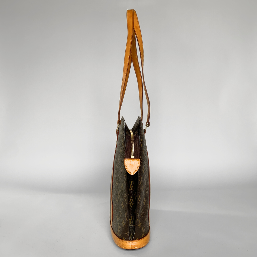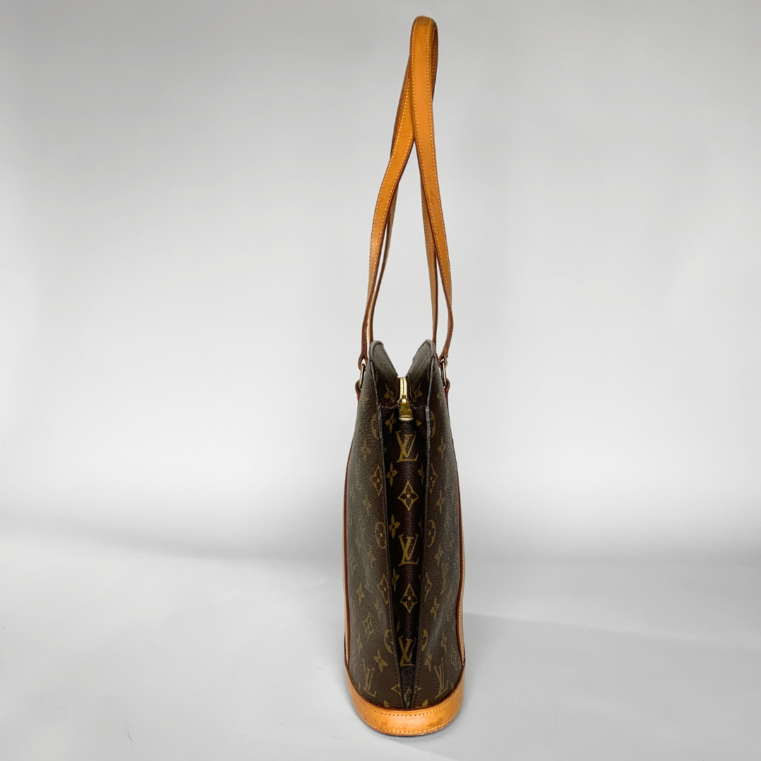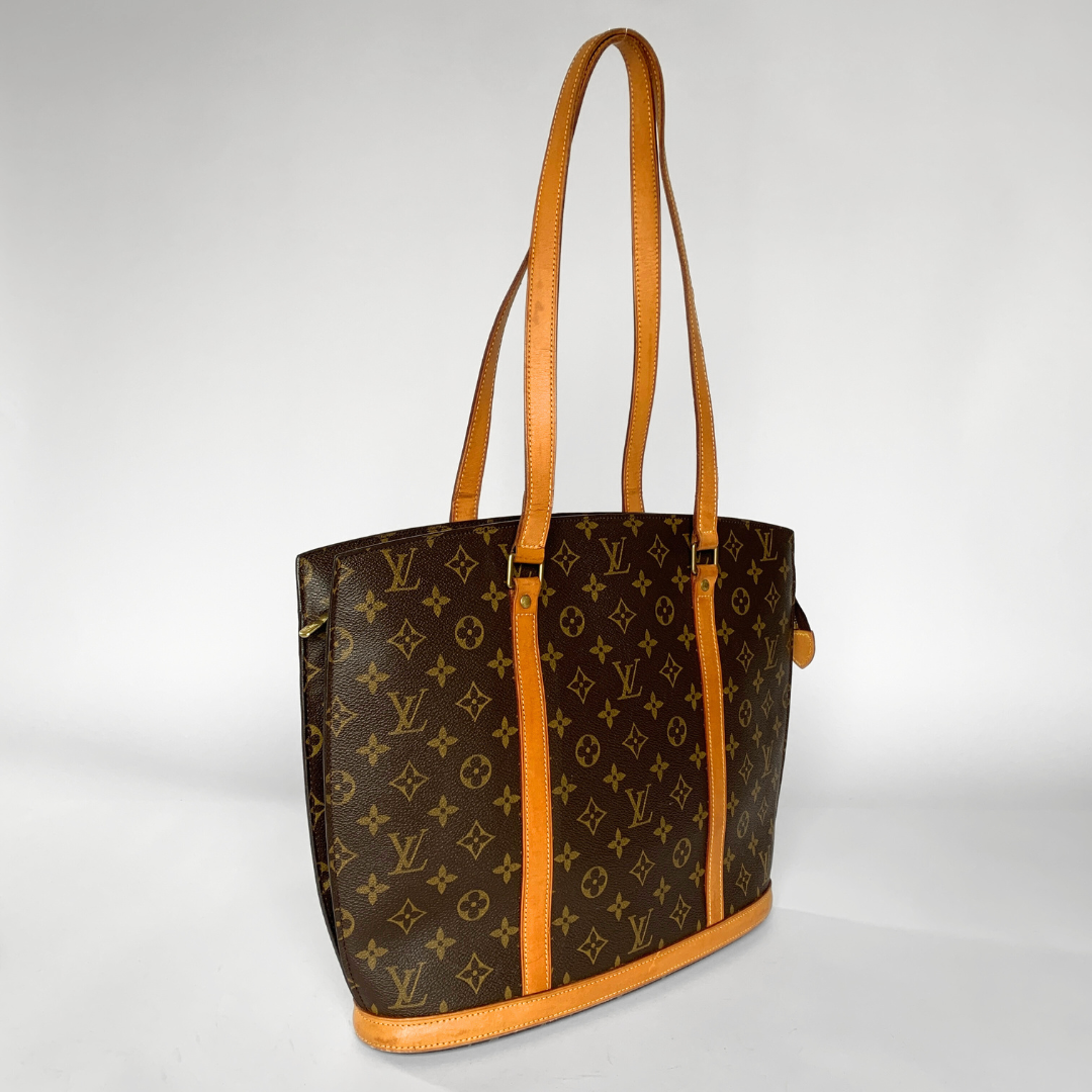 Louis Vuitton Babylon in Monogram Canvas. The bag has Vachetta leather trims and shoulder straps. The hardware is gold-colored. It's the perfect office bag!