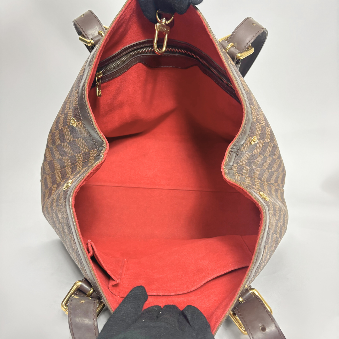 Louis Vuitton Hampstead in size PM, in Damier Ebene Canvas and Vachetta leather. The bag closes with a clip and features leather shoulder straps. The bag can be worn comfortably on the shoulder. The bag has gold-colored hardware. The Hampstead has one inside pocket which closes with a zipper and two smaller slide-in pockets. Its roomy interior, slouchy shape, combined with its timeless elegance makes the perfect everyday bag.