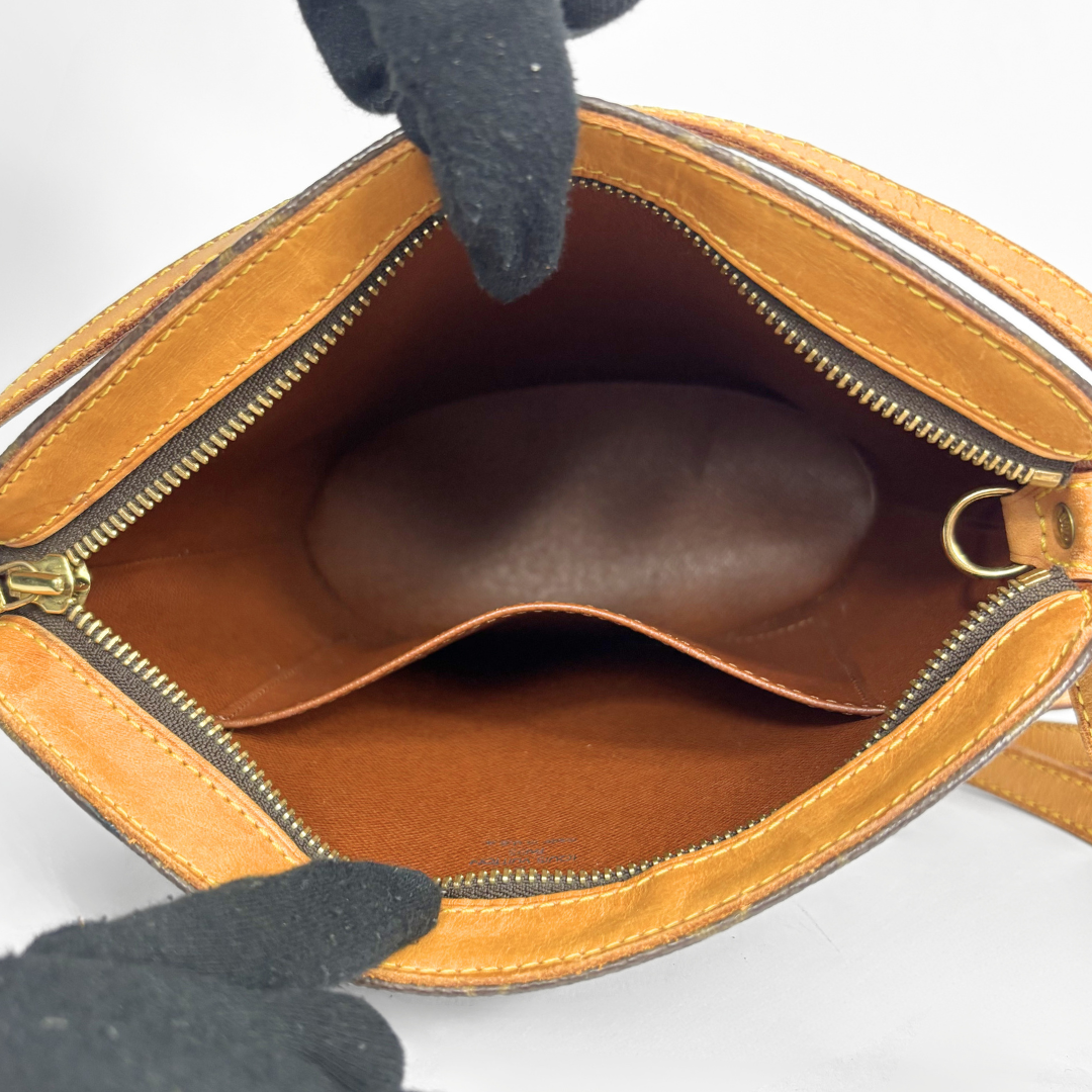 Louis Vuitton Drouot in Monogram Canvas with Vachetta leather details. A perfect carrier bag for every day with a special touch of luxury and style. The classic Monogram Canvas has been Louis Vuitton's trademark design since it was first introduced in 1896. The graphic symbols, including the quatrefoils and flowers, as well as the LV Monogram were used to prevent counterfeiting in the early days when it was first patented. Made of coated canvas, the Monogram's traditional look is also endured by its durability.