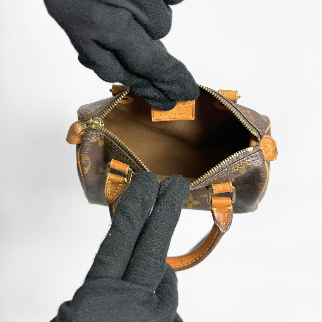 Louis Vuitton Speedy Mini made of Monogram Canvas and Vachetta Leather details with strap. The bag has gold-colored hardware. The bag can be opened with a zipper. It's a unique piece to add to your bag collectsion. The bag can be worn in the hand and cross body with the strap.