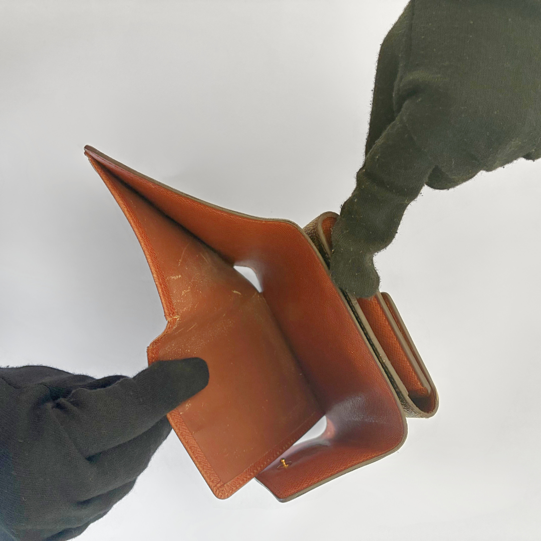 Louis Vuitton Trifold Wallet in Monogram Canvas. A timeless and truly iconic wallet for everyday use, because of the perfect size of the wallet and the multiple compartments. The two main compartments, both open with a push button. The inside of the wallet is colored brown and features one coin pocket, one card placement, and two slip-in pockets where you can store some cash. There are also two another compartment for cash or receipts.